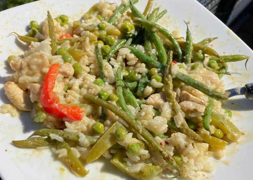 - When the veg has softened, empty in the coconut milk and tomatoes. Give it all a good stir to mix and bring to a bubble, before turning down to a simmer. Let it slowly reduce to make a thick, spicy sauce.