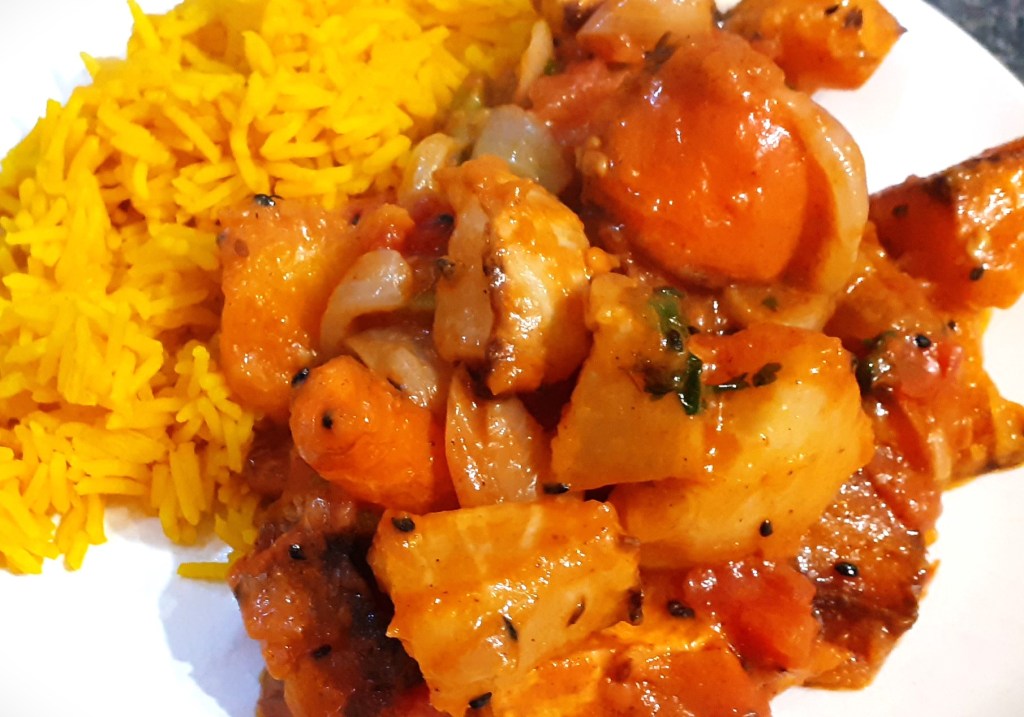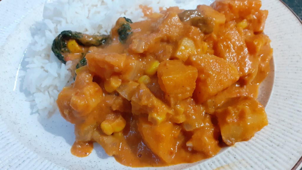 For this dish, which is suitable for both vegetarians and vegans, I’ve given a selection of seasonal squash and root veg a long, slow roast in the oven before coating it in a thick curry sauce. The roasting makes the veg soft, sweet and just a little caramelised around the edges.