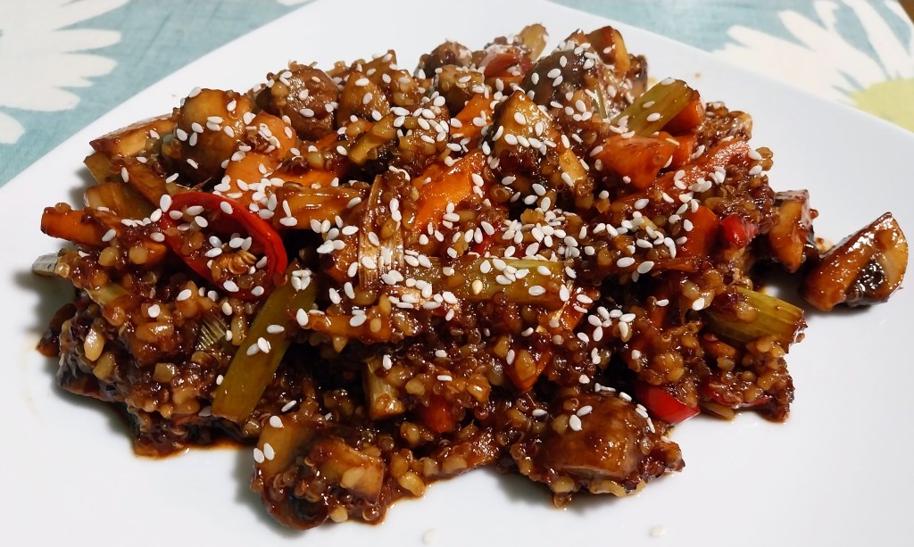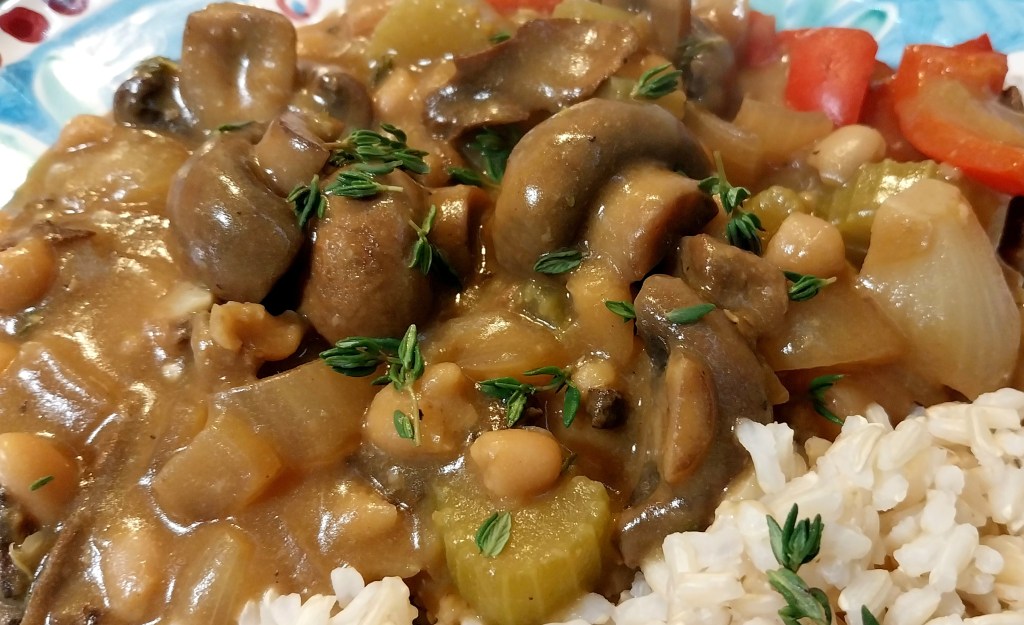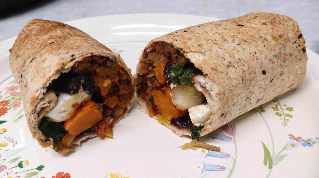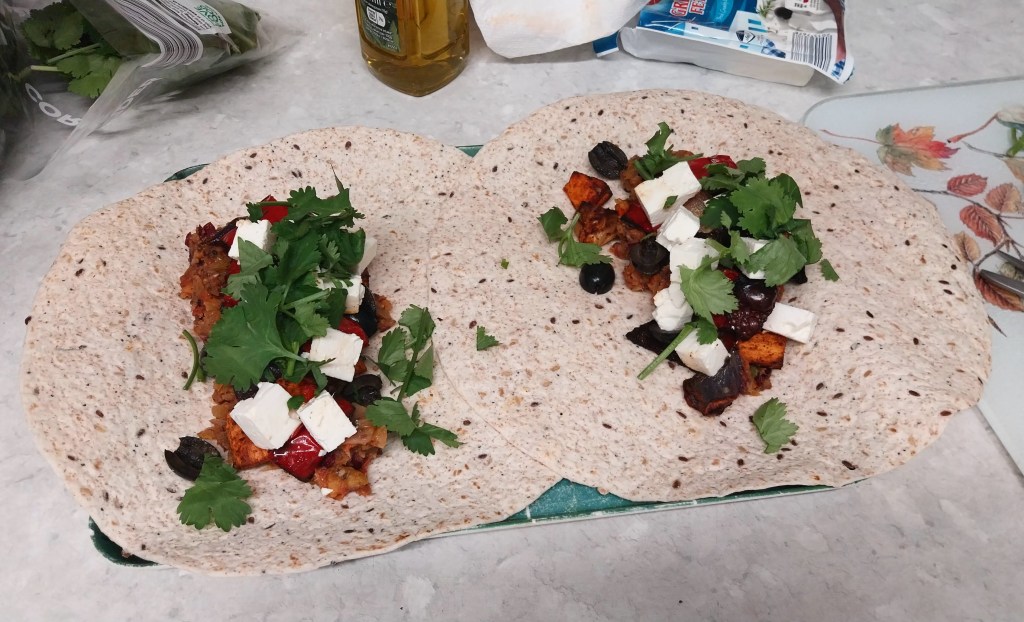 - Peel and chop the sweet potato into 1 – 2 cm sized chunks. Quarter the mushrooms, and cut the red pepper into pieces the same size as the sweet potato. Place all in a roasting dish. Sprinkle with the herbs and drizzle with oil, then place in the oven for 30 mins.