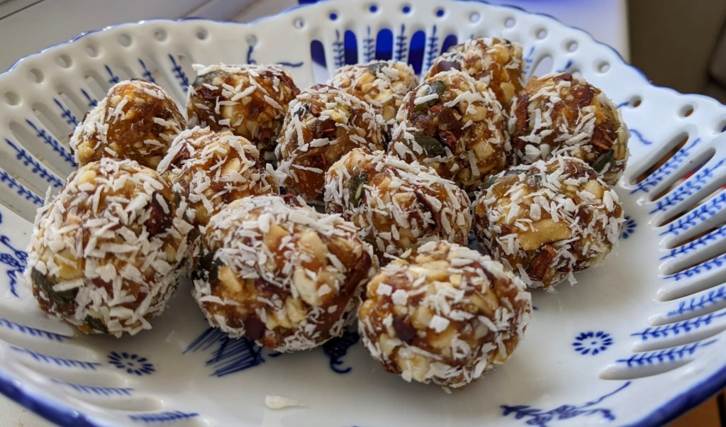 - Once the nuts have roasted for 10 mins, remove from the oven and roughly chop in a food processor with blade fitted. Scrape into a large bowl and set aside.