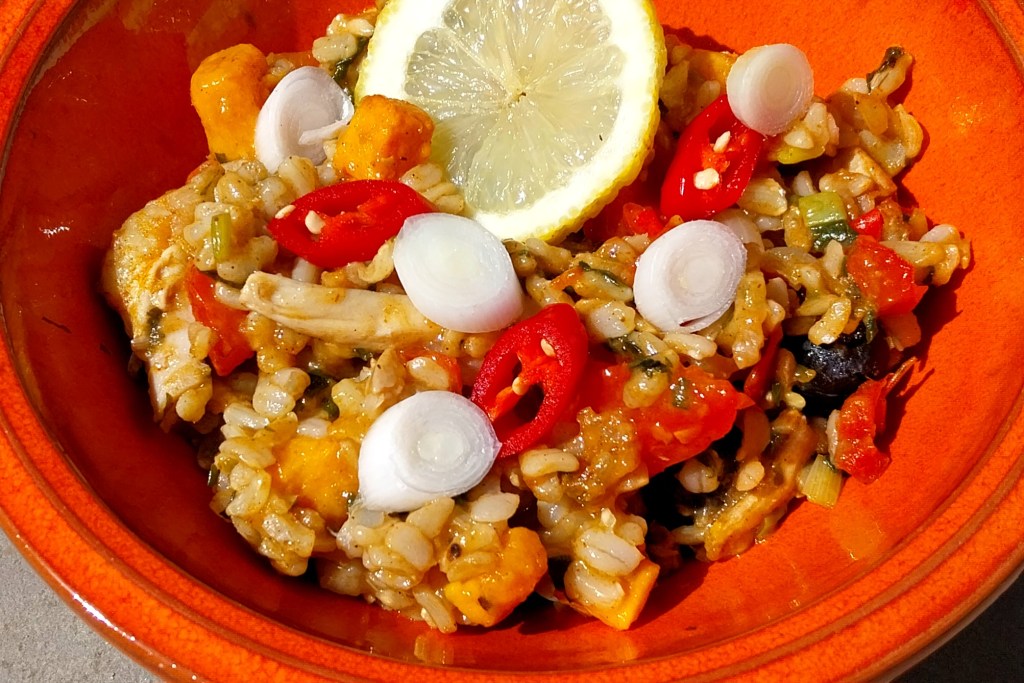 In this dish I’ve combined it with some leftover roast chicken, chicken stock, veg and brown rice to make a tasty bowl of sticky, fiery deliciousness. You can see from my photo above that I’ve garnished it with chopped red chilli and scallions, and a slice of fresh lemon.