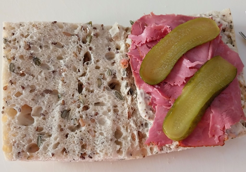 I began with a generously sized portion of freshly baked rye sourdough bread, and lined it with a blend of white wine mustard and mayo. To this I added about 5 slices of pastrami and some pickles.