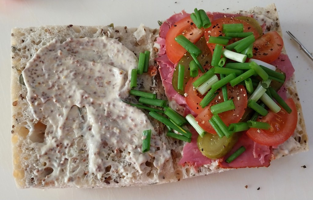 Next up are sliced tomatoes and chopped scallions (or spring onions) picked fresh from the garden. The inside of the upper slice is also now lined with mustard mayo.