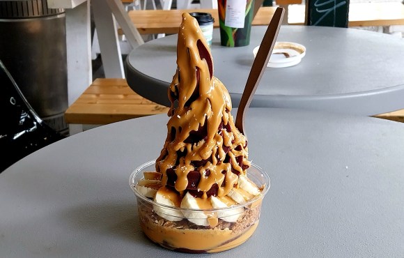 Serve warm from the oven with hot custard poured over – see my photo below.